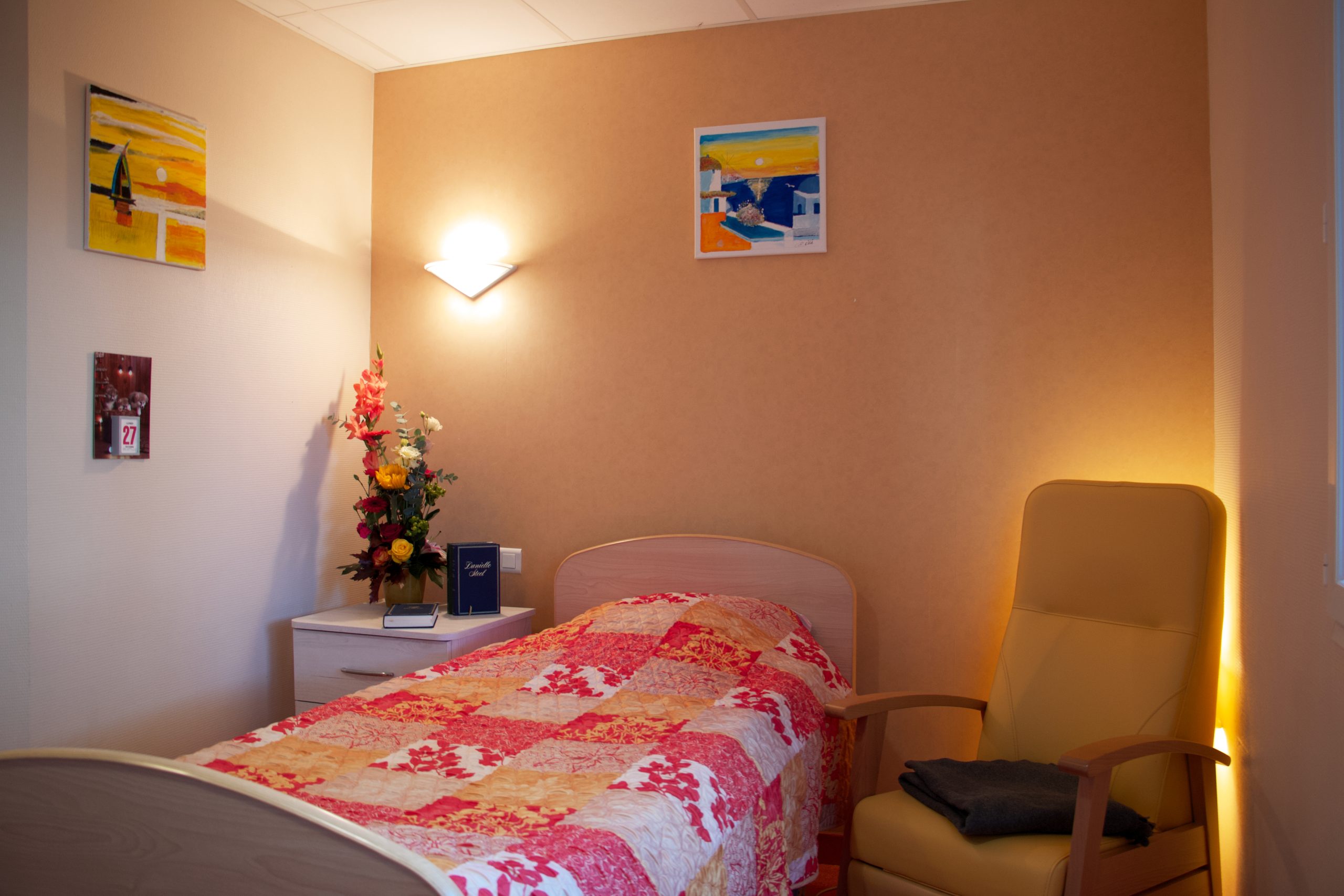 La résidence compte des chambres individuelles et des chambres doubles, réparties sur deux niveaux. Chaque chambre constitue un espace privatif, aménageable et personnalisable, permettant à chaque résident de recréer un environnement familier. Il est possible d’y installer du petit mobilier, des photos ou des objets personnels afin de préserver les repères et l’intimité de chacun(e).